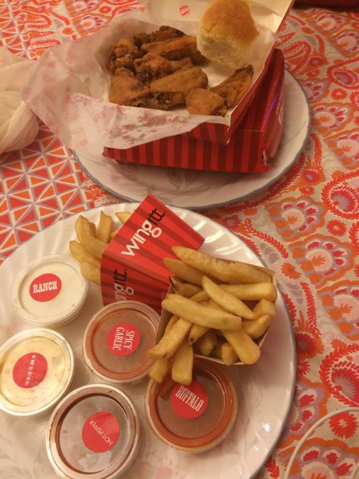 I stumbled upon Wingitt quite by accident, when I went to pick up flowers from Just Flowers next door (A beautiful little flower shop with an amazing variety, by the way). It's a little shop, nothing to boast of, but has made the most of its space. Spotlessly clean, there is a small seating area, with cute red metal buckets serving as napkin holders and a small bottle of Dettol hand sanitizer on each table.